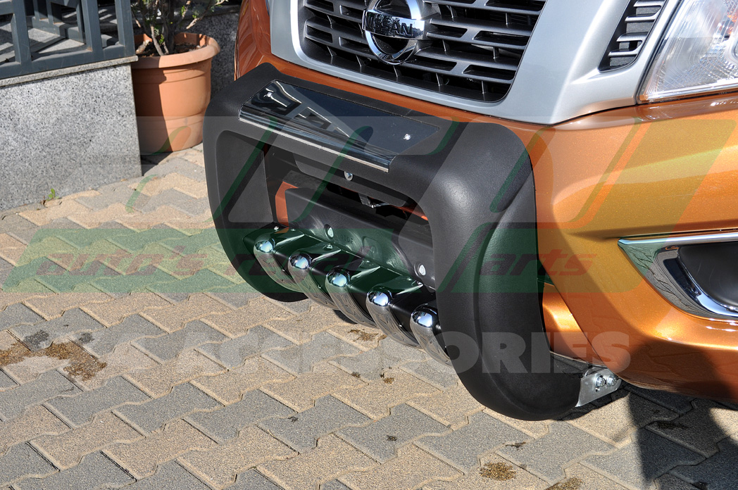 Bullbar protectie bara fata din poliuretan pentru Nissan Navara fabricat din insertie de plastic dur aplicata pe un corp metalic. Nu este un produs universal. Acest bull-bar este fabricat dupa liniile masinii Nissan Navara. Personalizat. Kit de montaj inclus. Bara vine ambalata in folie de protectie pentru o livrare in conditii de siguranta.